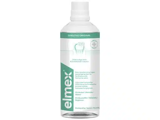 elmex® SENSITIVE TANDSPOELING met aminfluoride geeft extra bescherming tegen gevoelige tanden en tandhalscariës. Het sluit open tandbuisjes en bevat geen alcohol.